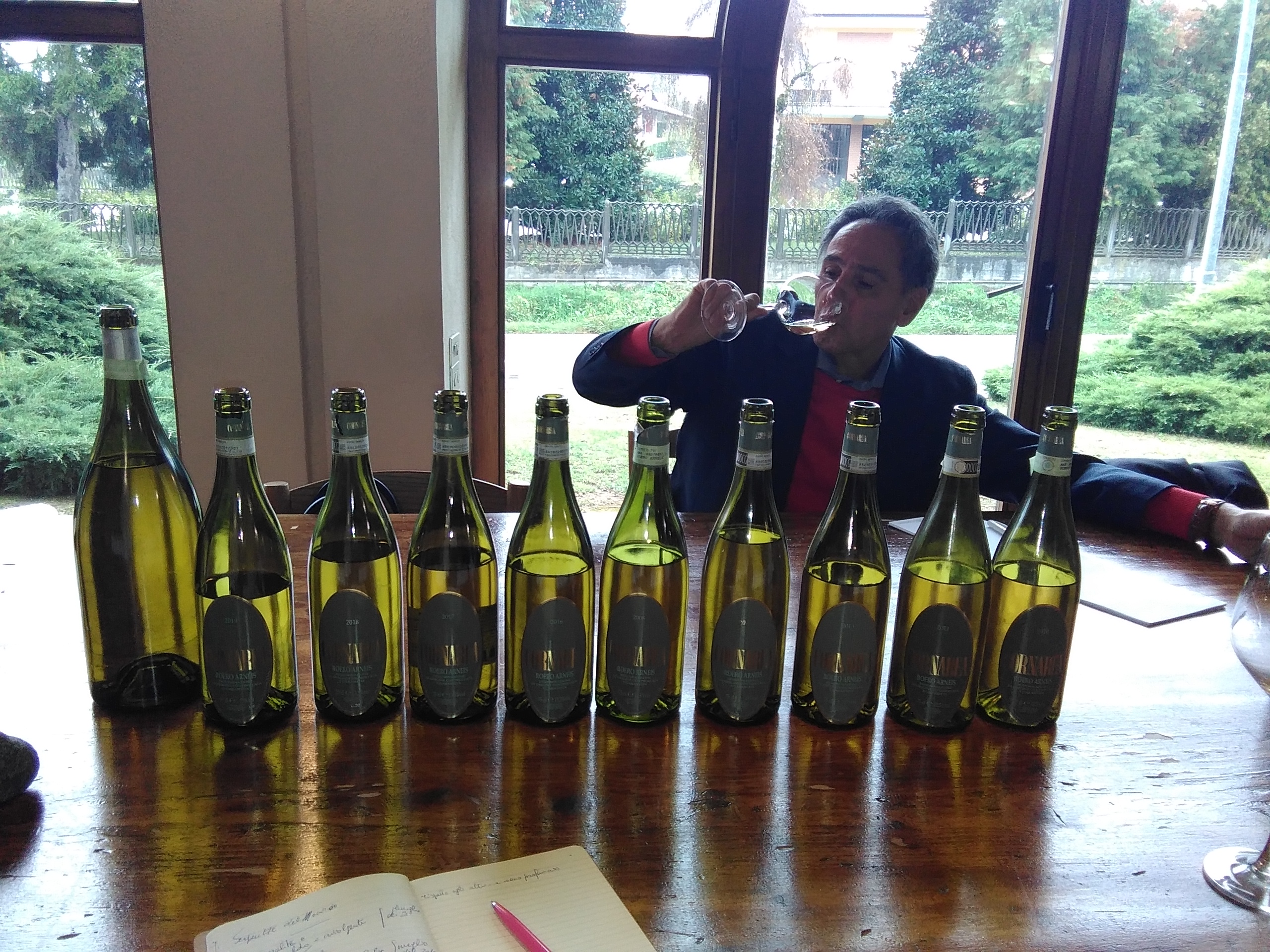 Lasciata a malincuore S. Vittoria d’Alba ci dirigiamo a Vezza d’Alba dove ci attende Pier Bovone dell’Azienda Agricola Cornarea. In una bella e moderna cantina Pier ci sorprende con un’incredibile verticale di Roero Arneis: dal 2019 a ritroso quasi per ogni anno, sino ad arrivare ad uno strepitoso 2008 e concludere in bellezza con un sorprendente “1983” (alla faccia di chi mette in dubbio la longevità dell’Arneis!).