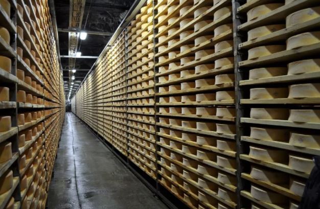 Nella foto che segue, un suggestivo colpo d’occhio del magazzino di stagionatura della Cooperativa produttori di Fontina in Valpelline, realizzato all’interno delle antiche gallerie di Frissonière (dove si conservano fino a 60.000 forme), un ambiente ideale per la stagionatura che dura circa 80/90 gg.