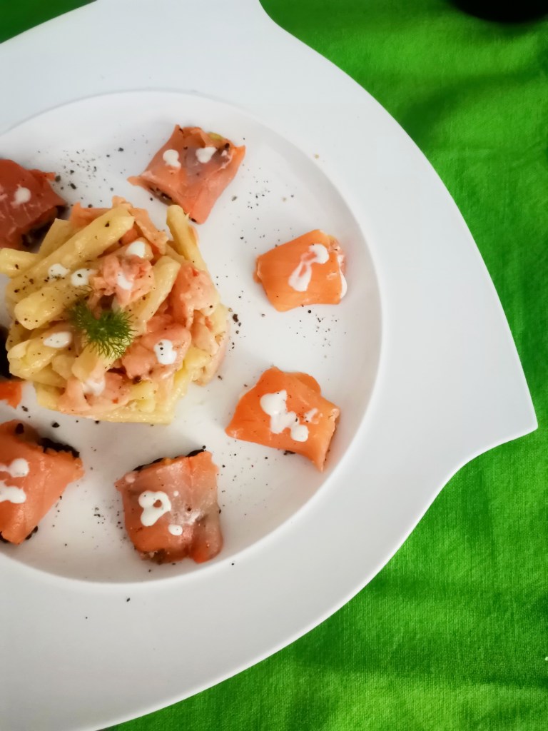 Questa è una variante alla classica pasta al salmone ed è veramente gustosa, con l’acidità dello yogurt e la speziatura del pepe.