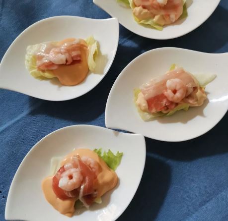 - preparate la maionese e ponetela in una ciotola con un cucchiaio di angostura e qualche goccia di succo di lime, amalgamate bene. Prendete delle ciotoline da aperitivo, metteteci sopra una foglia di insalata bella fresca, la salsa ottenuta e adagiate sopra i gamberetti avvolti nel lardo;