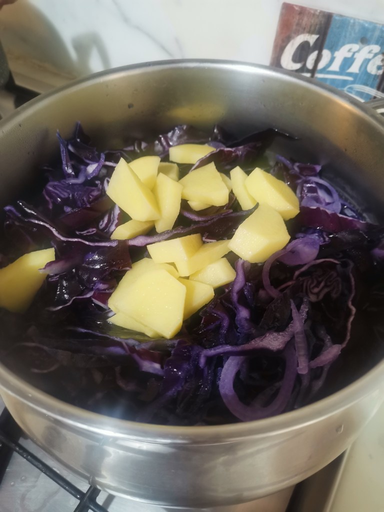 Dopo aver tagliato il cavolo a quarti ed aver eliminato il torsolo, lavatelo bene sotto l’acqua corrente, tagliatelo a listarelle e mettetelo in un tegame dove avrete fatto rosolare la cipolla tagliata con un filo di olio.
