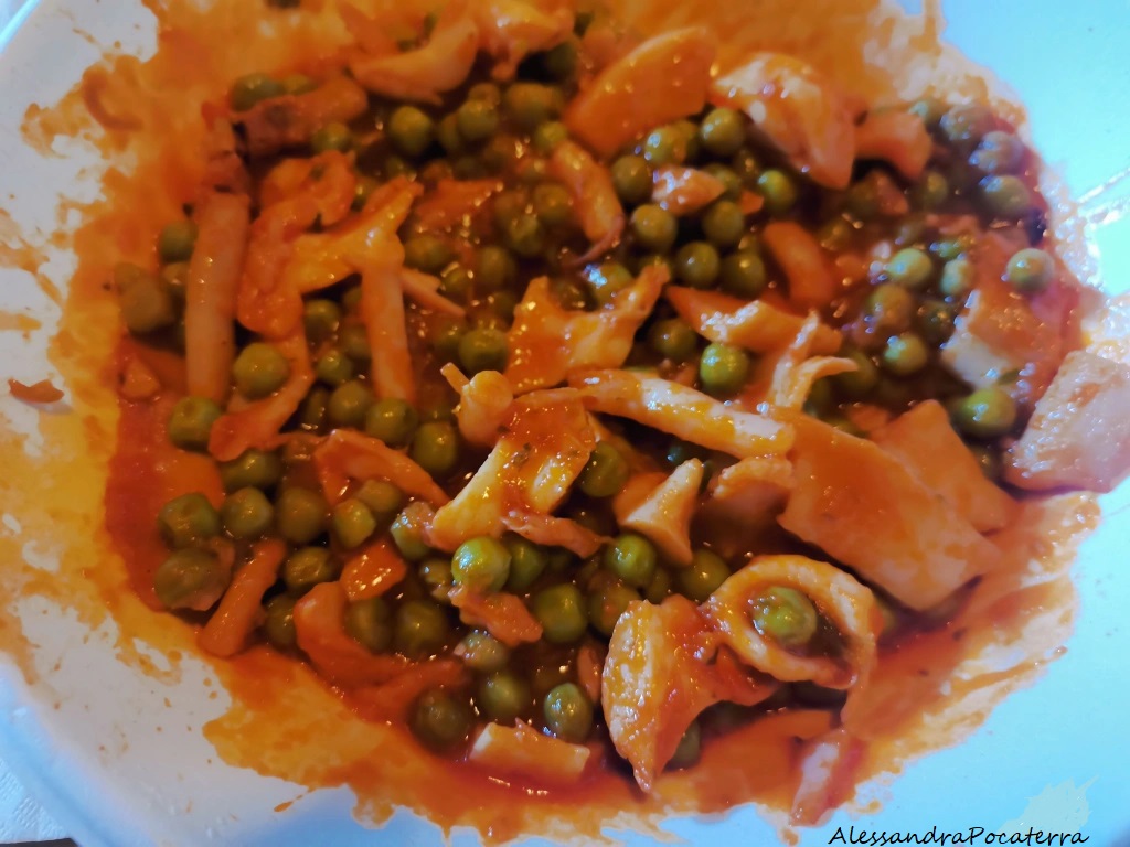 Passati 20 minuti, aggiungete i piselli sgranati, mescolate e portate a cottura, dovrà cuocere sempre a fuoco dolce e coperta per circa 30 minuti.