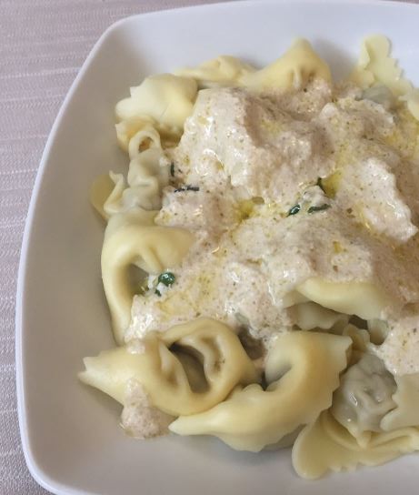 Al momento dell’utilizzo la salsa di noci non va riscaldata ma semplicemente allungata con un po’ di acqua calda della pasta.
