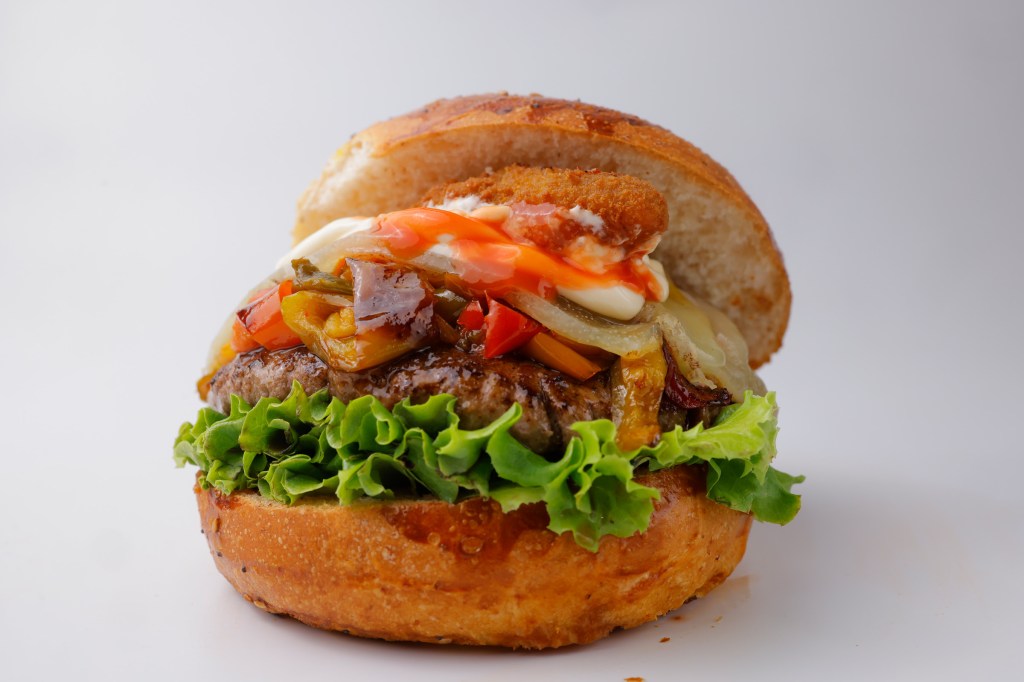 buns, hamburger di maremmana, lattuga gentile, pecorino di Pienza semi stagionato, peperoni spadellati sale e pepe, maionese, e jalapeno e salsa habanero.