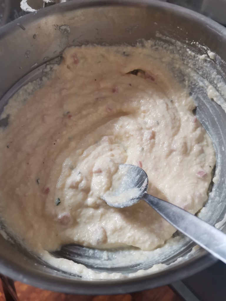 Mettete in una terrina il lievito e stemperatelo con un po’ di acqua tiepida, unite le uova e via via la farina e l’acqua rimasta; salate e amalgamate bene facendo attenzione che non si formino grumi.