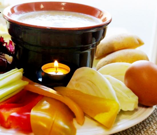 Versate il composto nel “fujot” – il tipico fornellino di terracotta con la fiammella – e servite ai Vostri ospiti accompagnando con i piatti contenenti le verdure e gli ortaggi.